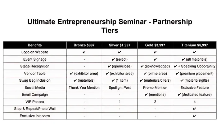 We make sure every partnership level delivers 3–5x its value in exposure, leads, and opportunities. Whether you choose Titanium, Bronze, Silver, or Gold, you’ll walk away knowing your investment created impact and results.